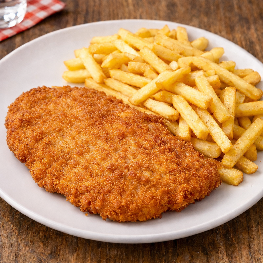 | Paniertes Schnitzel Wiener Art aus Schweinelachs, mit Pommes Frites A C DI | 12,00 |